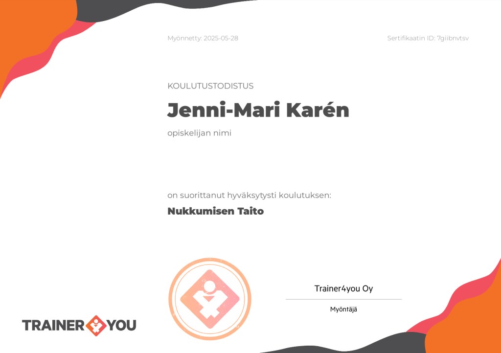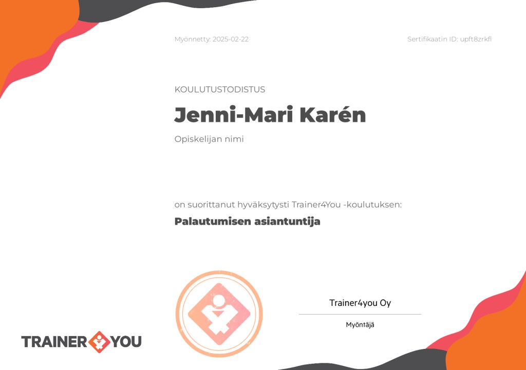 Olen Jenni-Mari Karén, kokonaisvaltaisen hyvinvoinnin valmentaja ja positiivisen vuorovaikutuksen sanansaattaja.
